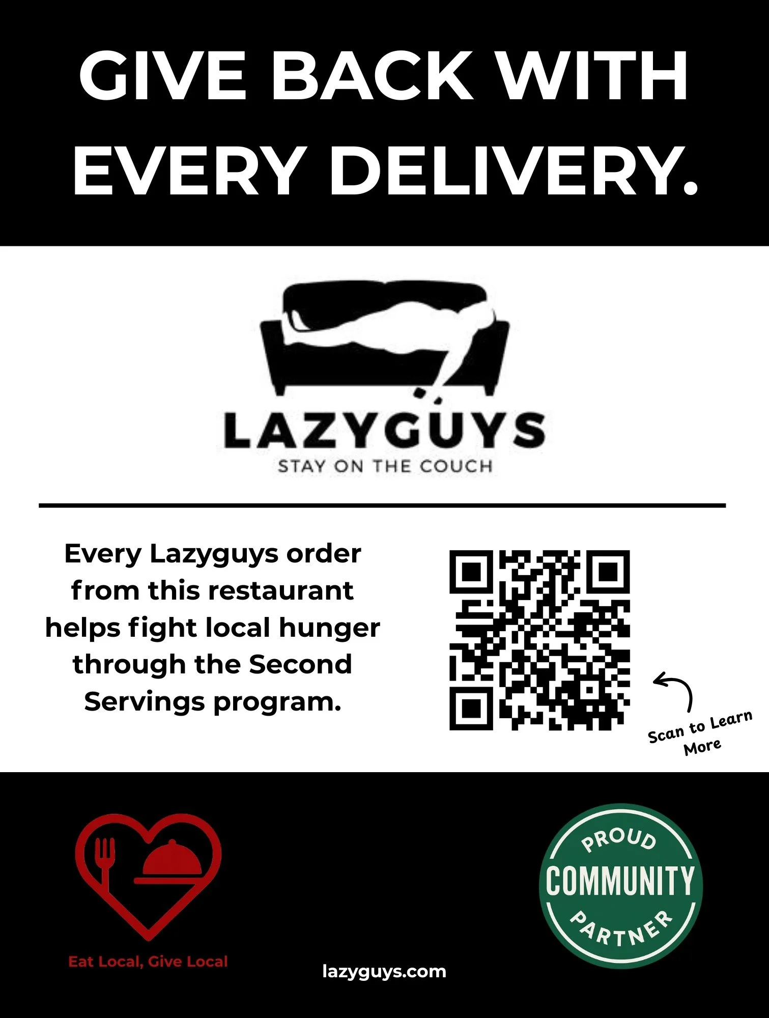 Through our Eat Local, Give Local initiative, Lazyguys donates 1% of all delivery and takeout sales from participating restaurants directly to Starkville Strong’s Second Servings program.